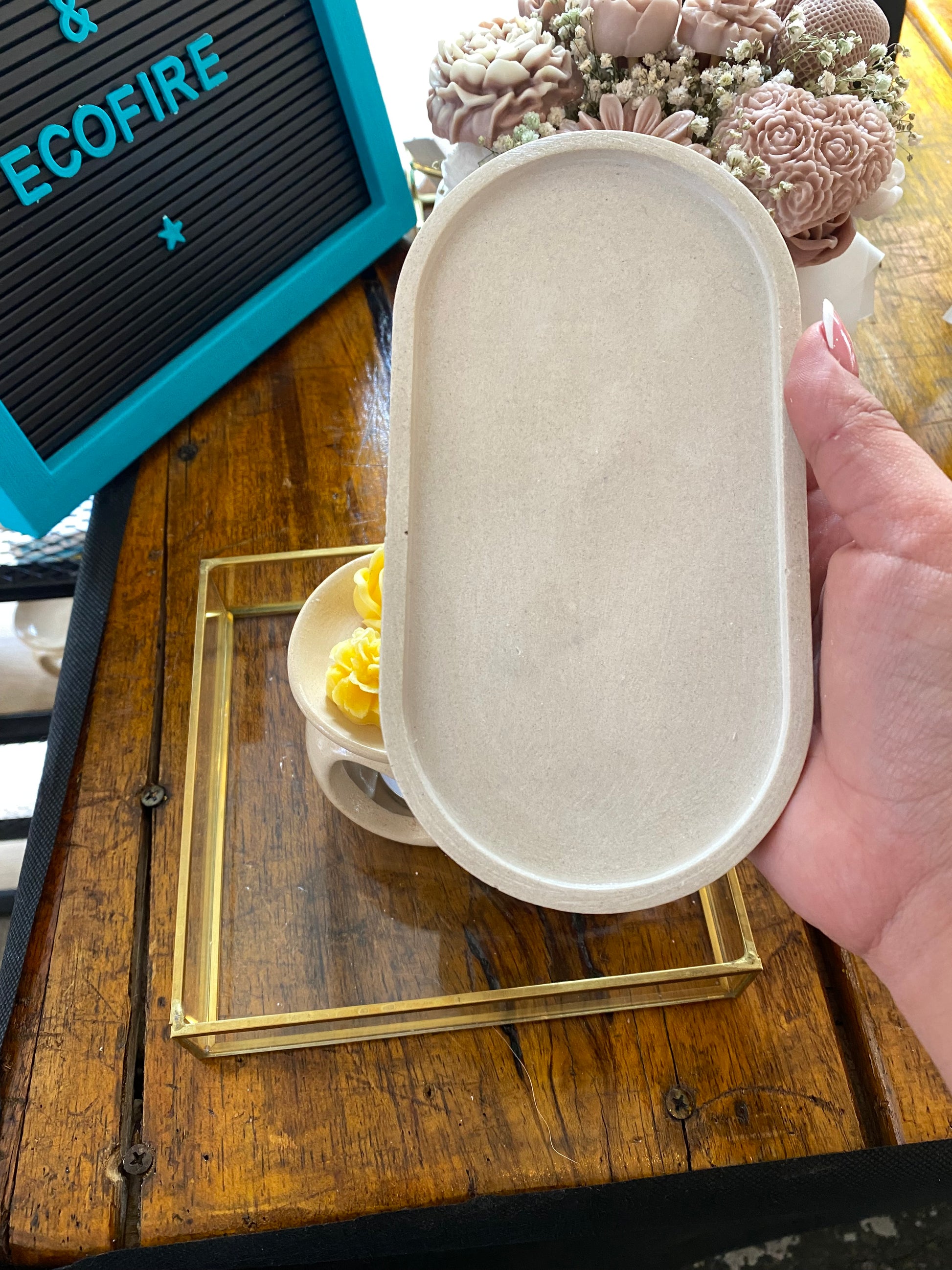 Elaborada de forma 100% artesanal, cada pieza es única, con un acabado brillante y textura suave. Además de ser decorativa, es funcional y versátil, perfecta como bandeja para velas, soporte de fragancias o accesorio de escritorio.