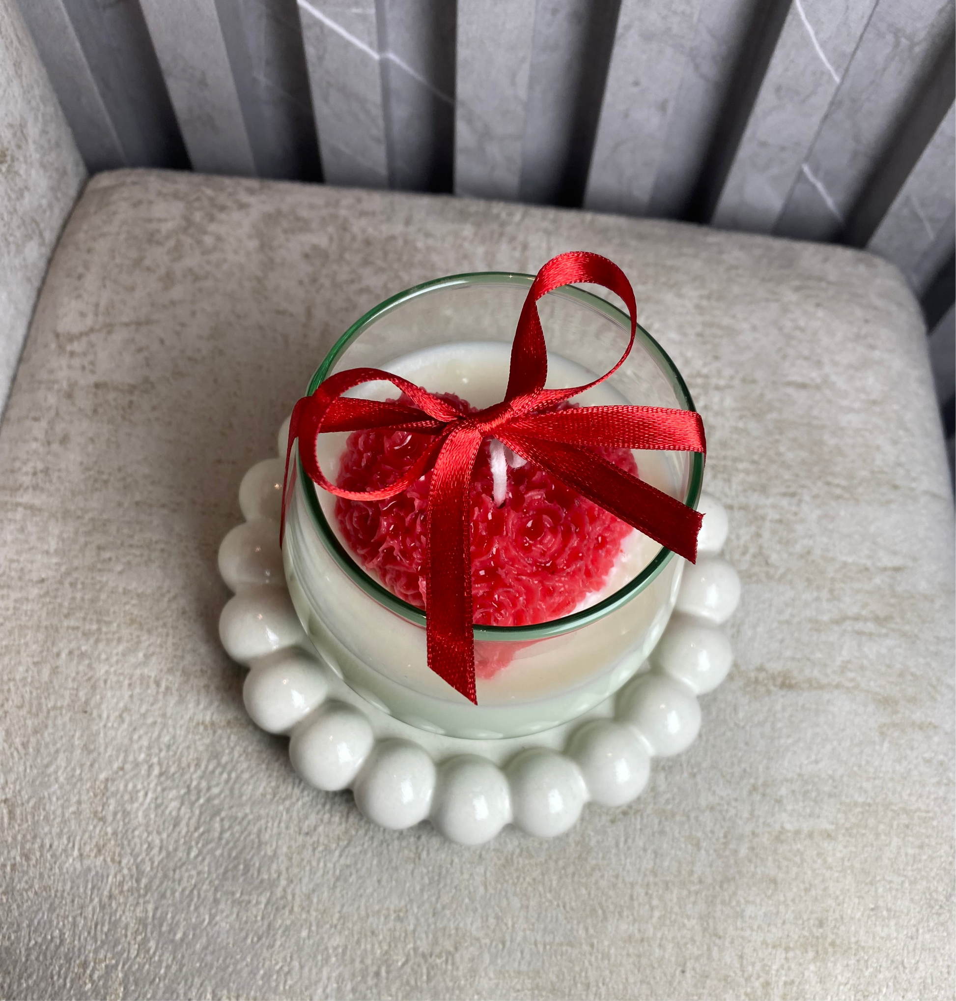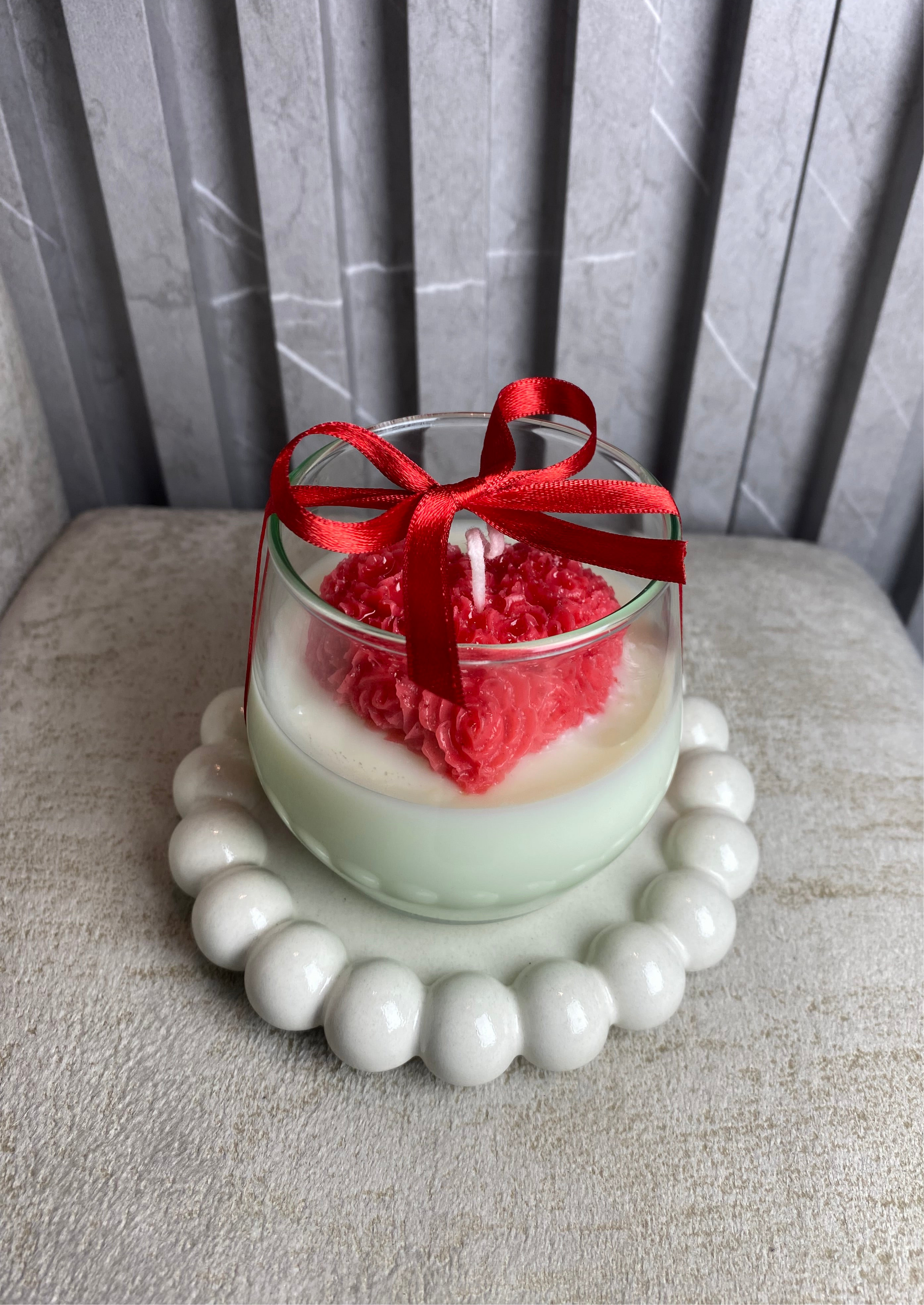 Un detalle perfecto para celebrar los lazos más especiales, esta vela artesanal está elaborada en cera natural y presentada en un delicado vaso de vidrio, decorada con un corazón de rosas y un lazo rojo que la convierte en el regalo ideal.