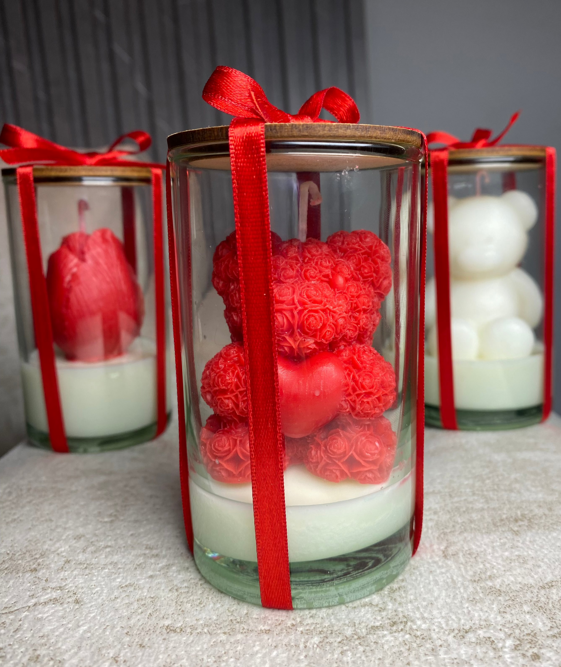 Transforma tu espacio con nuestra Vela Aromatizante Premium en forma de oso de rosas, elaborada con una combinación de cera molde premium y cera de soja natural, con un peso total de 91 gramos.